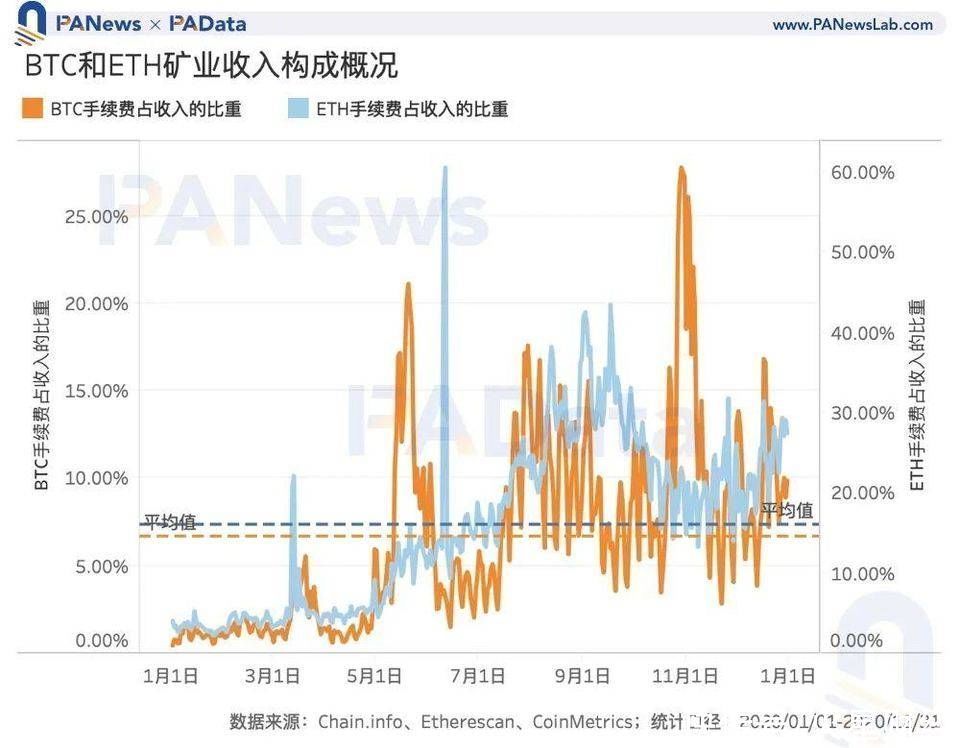 相比之下,2020 年 ETH 矿业的手续费总额约为 6.31 亿美元,且全年增长态势显著,尤其是三季度,火爆的 DeFi 流动性挖矿致使以太坊网络变得拥挤,手续费快速上涨,手续费占矿工收入的比重也从季度初的 17.34% 提高至季度末的 30.05%。受此影响,全年 ETH 矿业手续费收入占总收入的平均比重也达到了 16.06%,较同期比特币的手续费占比高出近 10 个百分点。