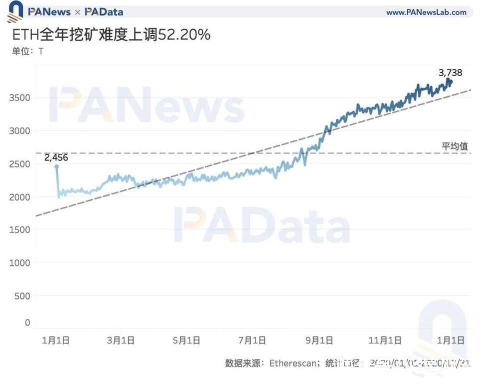 以太坊全年挖矿难度的调整幅度则较比特币同期略高,挖矿难度从年初的 2456 T 上涨至年末的 3728 T,全年上调了约 52.20%,与 2019 年全年上调 5.32% 相比,今年 ETH 的挖矿难度有了大幅的提高。