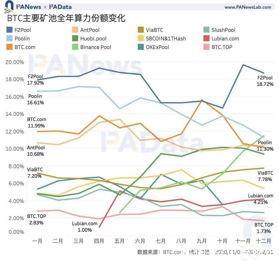 2020 年矿池领域另一大值得关注的消息是交易所矿池「显露头角」,、OKExPool、Binance Pool 三大所纷纷设立 BTC 矿池,截至年末,三大所的算力份额分别约为 9.39%、3.57% 和 11.48%。从趋势来看, 和 Binance Pool 的算力份额呈持续增长态势,尤其是 Binance Pool,在 BTC 行情最好的四季度,其算力份额显著增长了 4 个百分点以上,市场排位上升了 4 个名次。