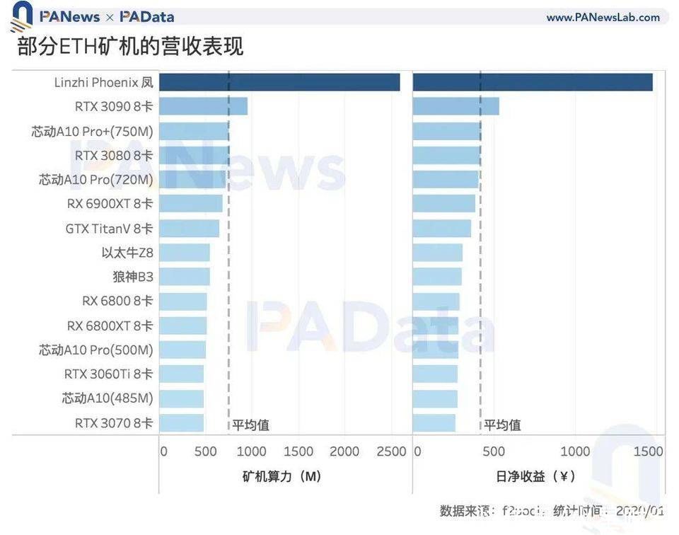 15 款矿机的平均算力约为 747 M,其中算力最高的是 Linzhi Phoenix 凤,算力达到了 2600M,远高于市面上其他 ETH 矿机。如果按照 0.34 元 / 度的价钱计算成本的话,这 15 款矿机的平均日净收益约为 418 元,其中 Linzhi Phoenix 凤的日净收益达到了 1477 元,同样远高于市面上其他矿机。